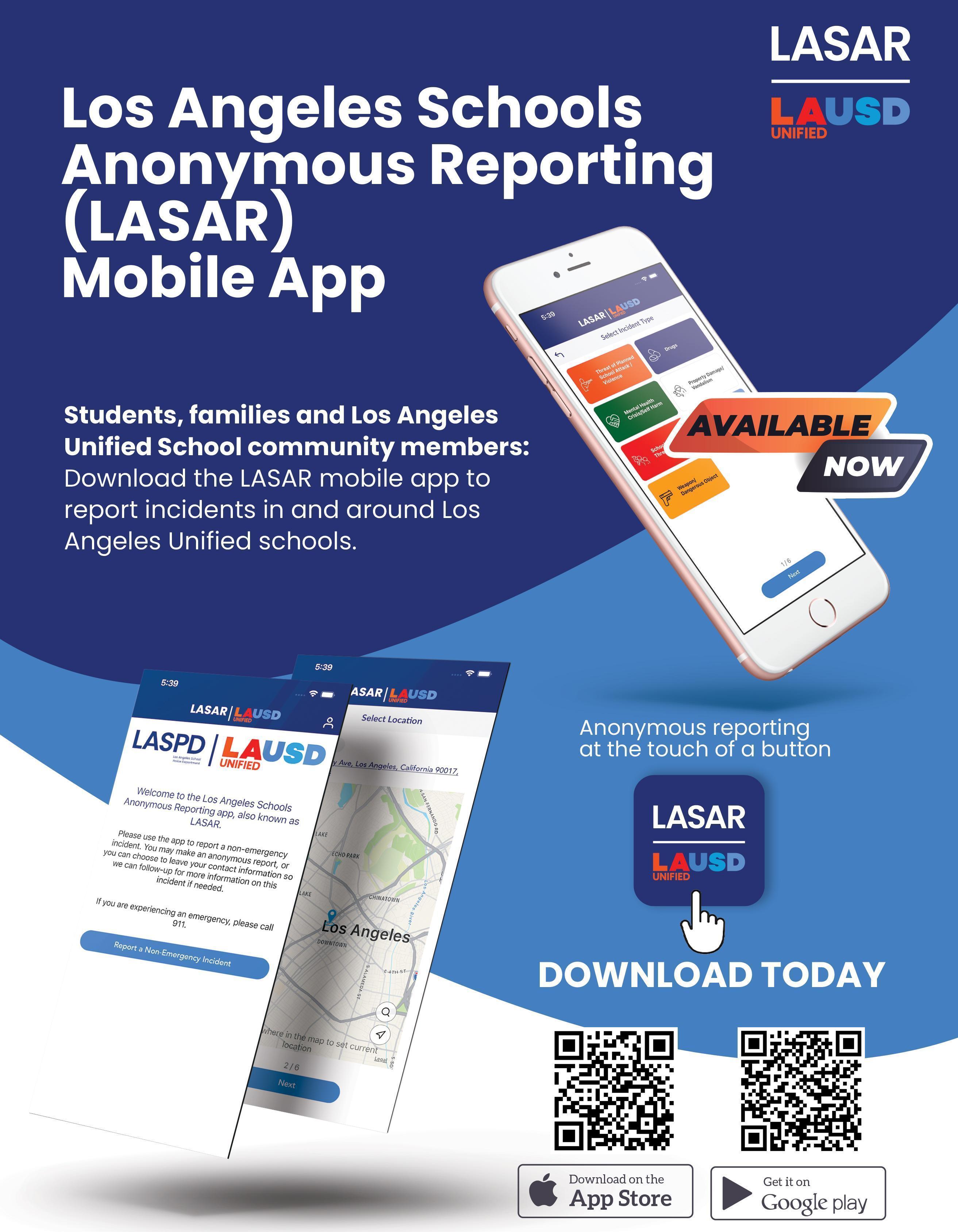 Students and families can download the LASAR app by visiting the Apple app store or Android app store and searching “Los Angeles Unified LASAR.”